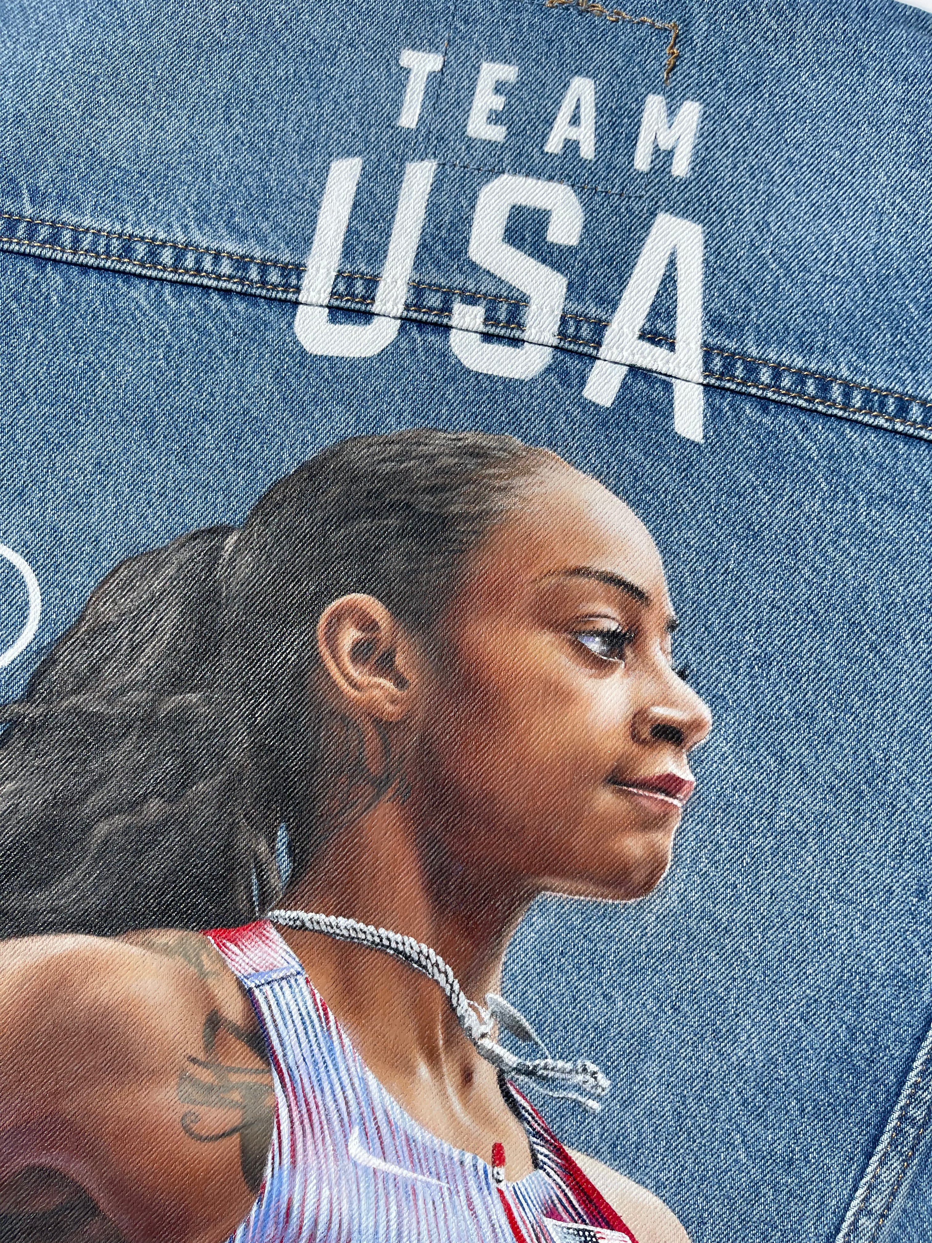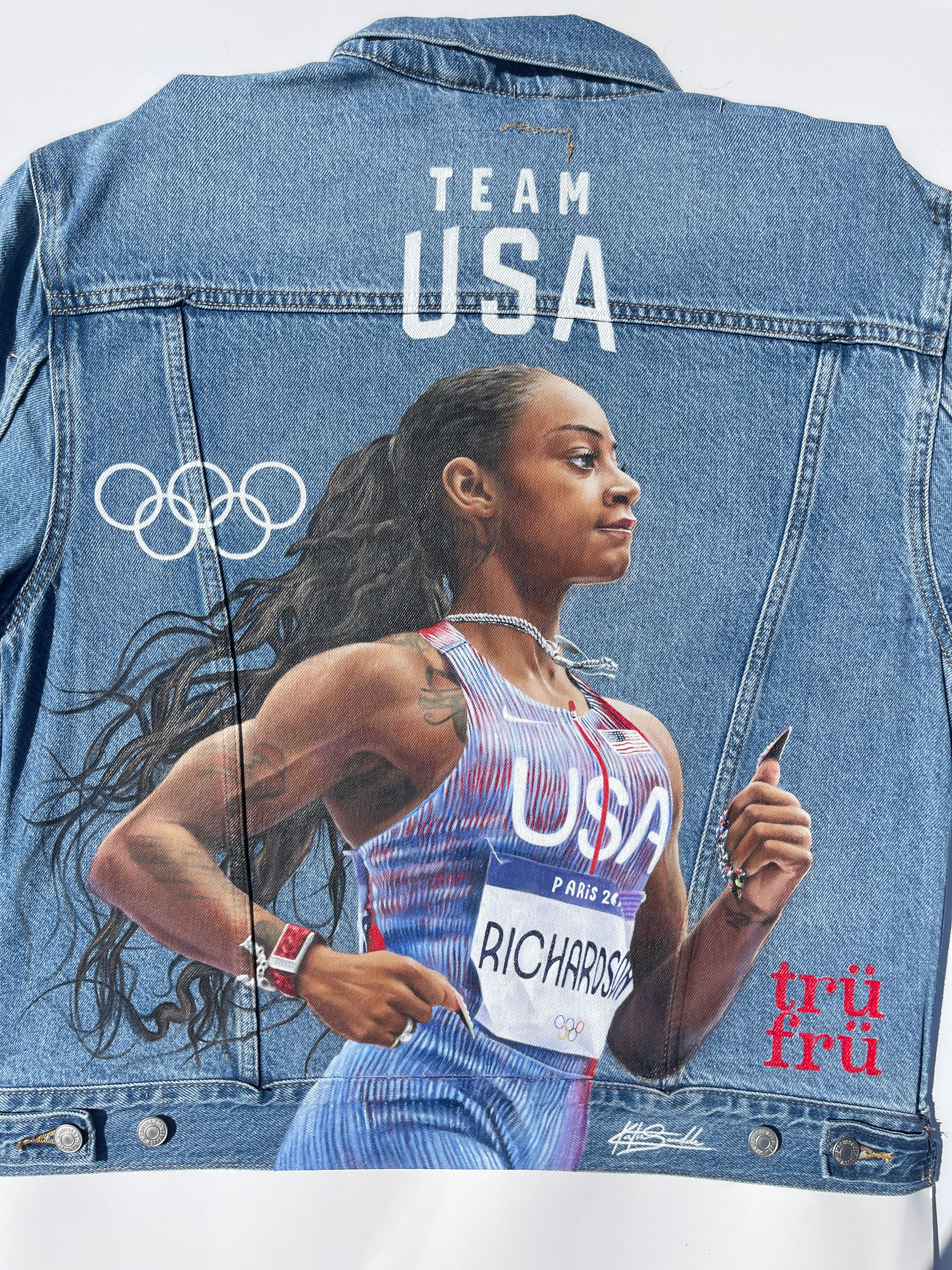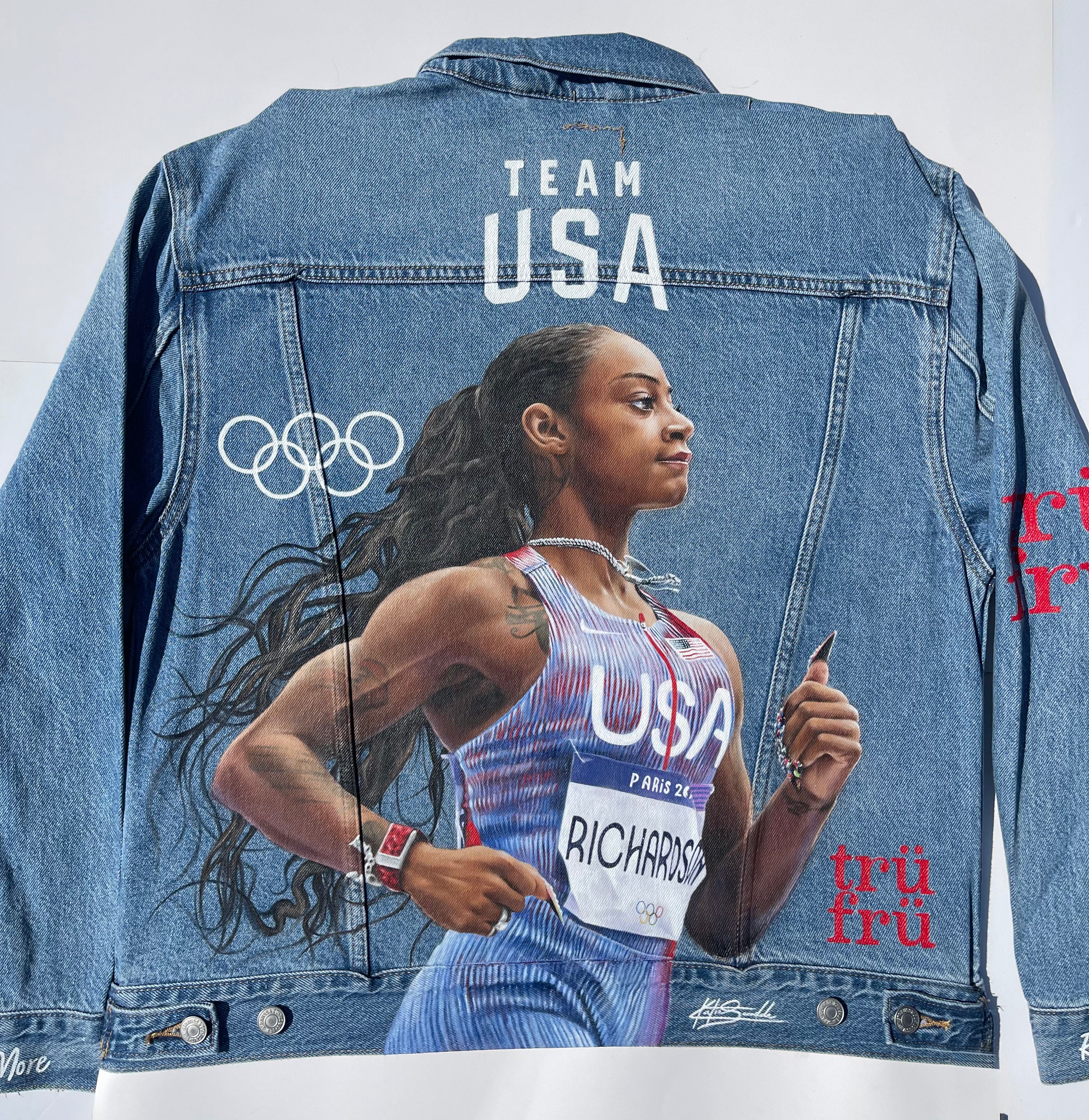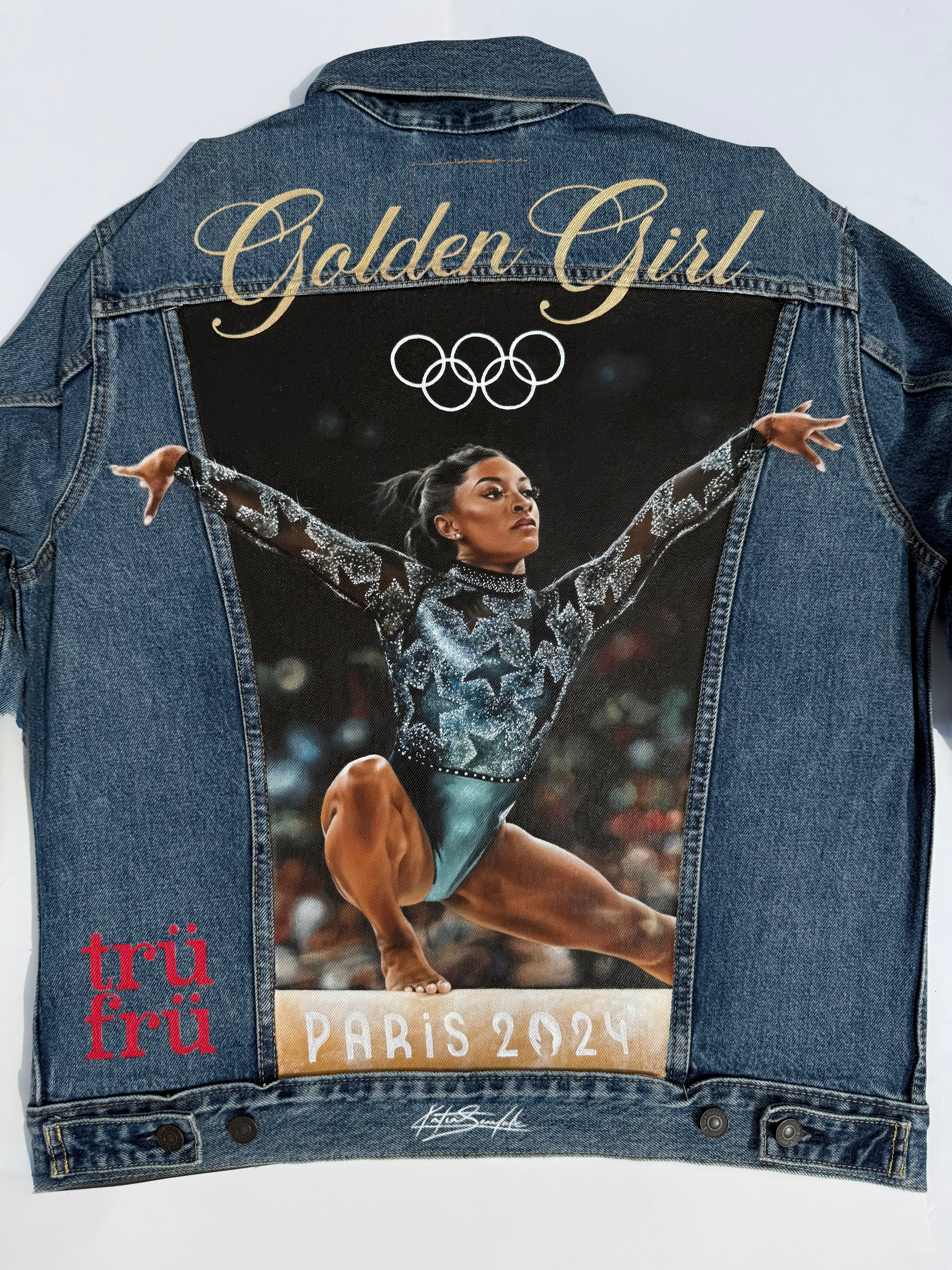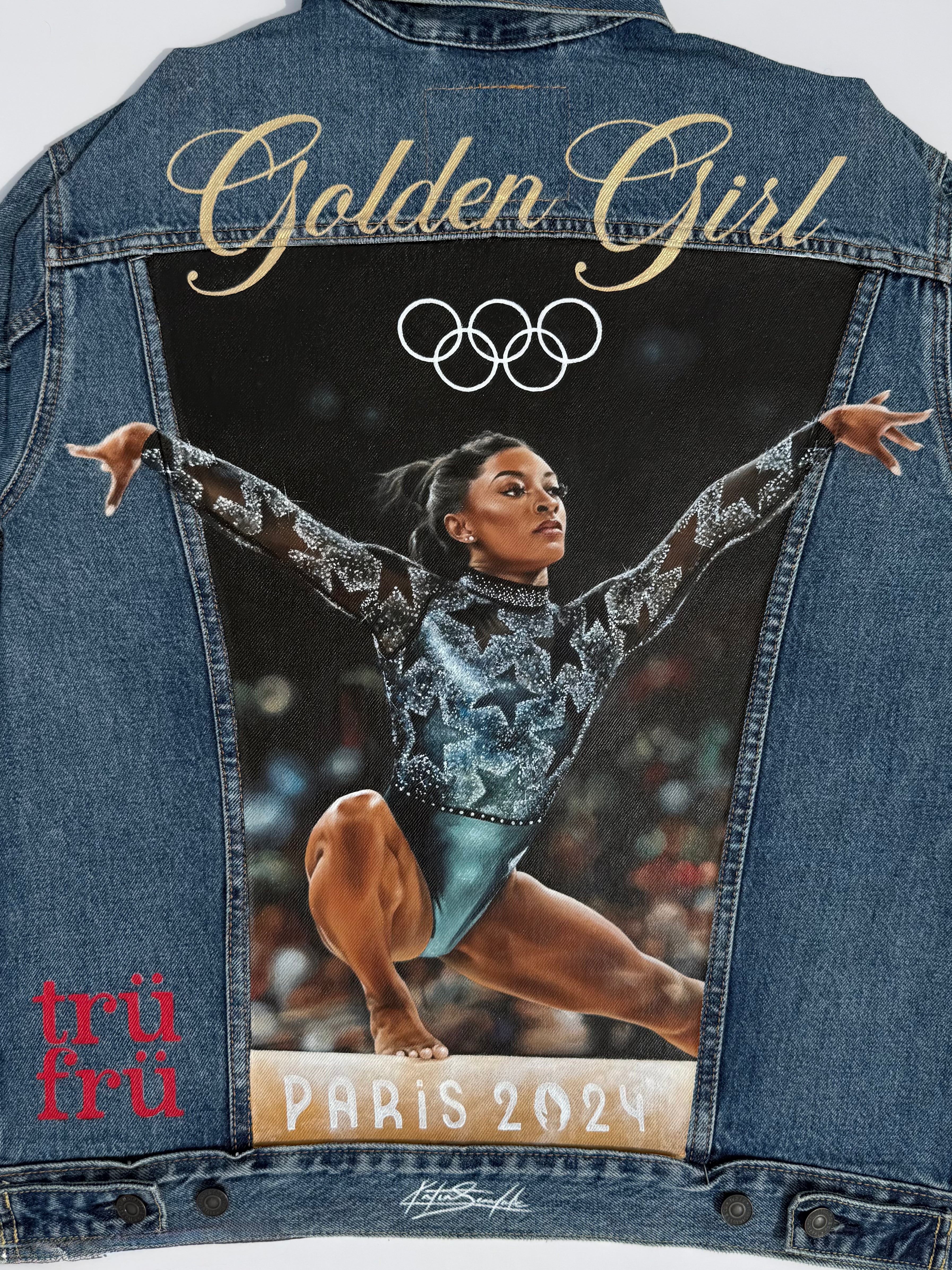 Trü Frü commissioned Katia to design and paint a denim jacket for the 2024 Olympian Medalist. (3/4)