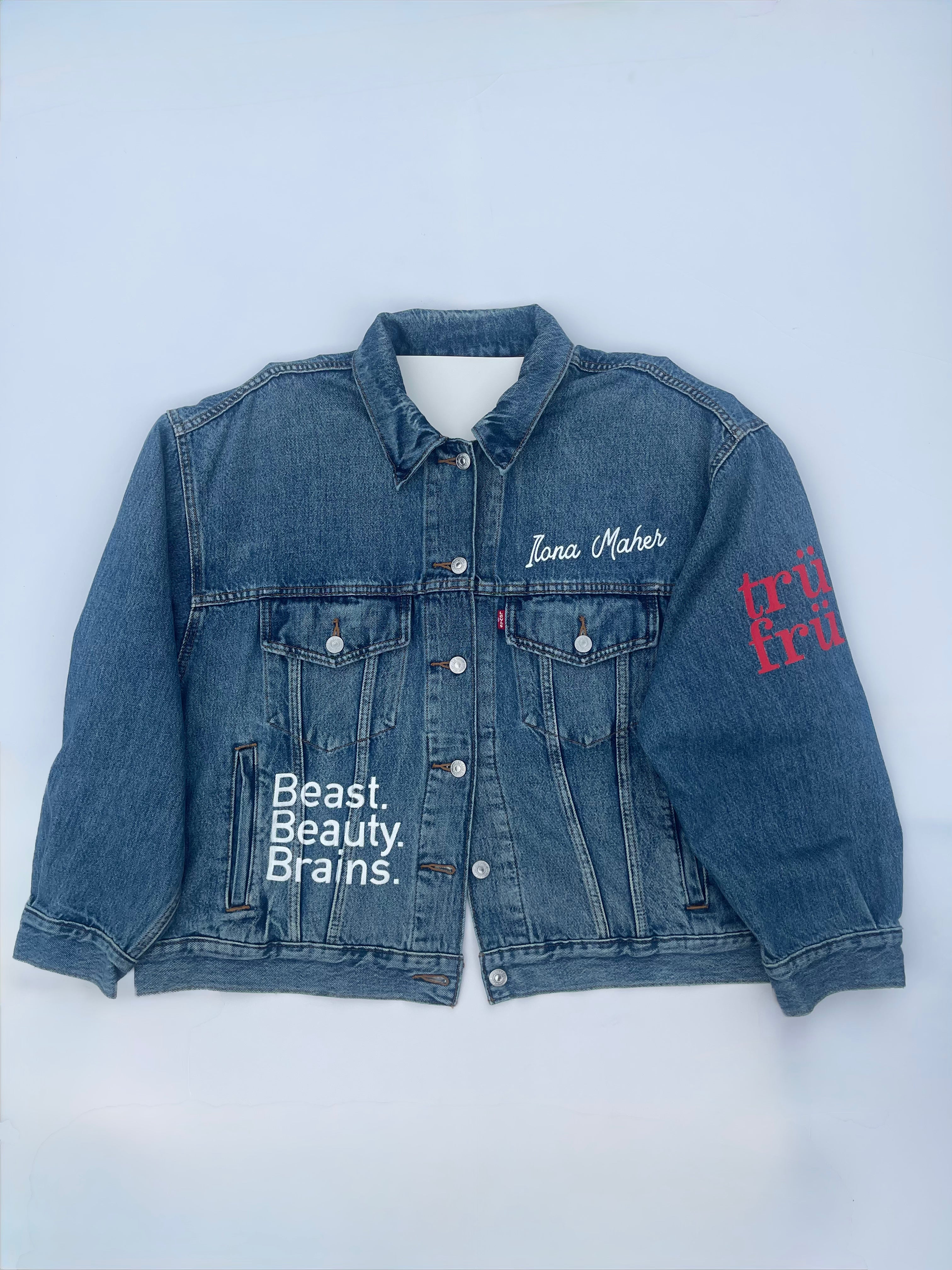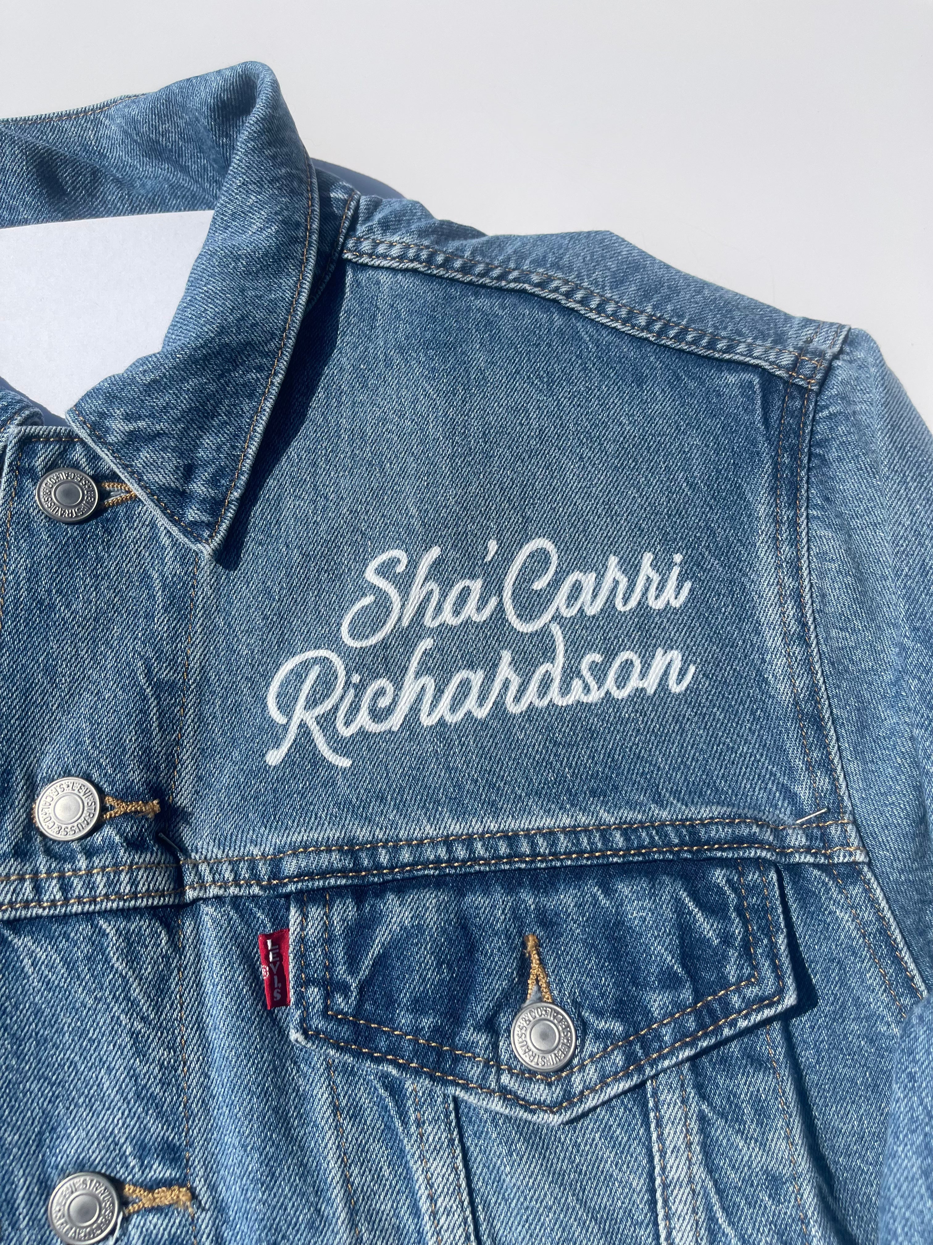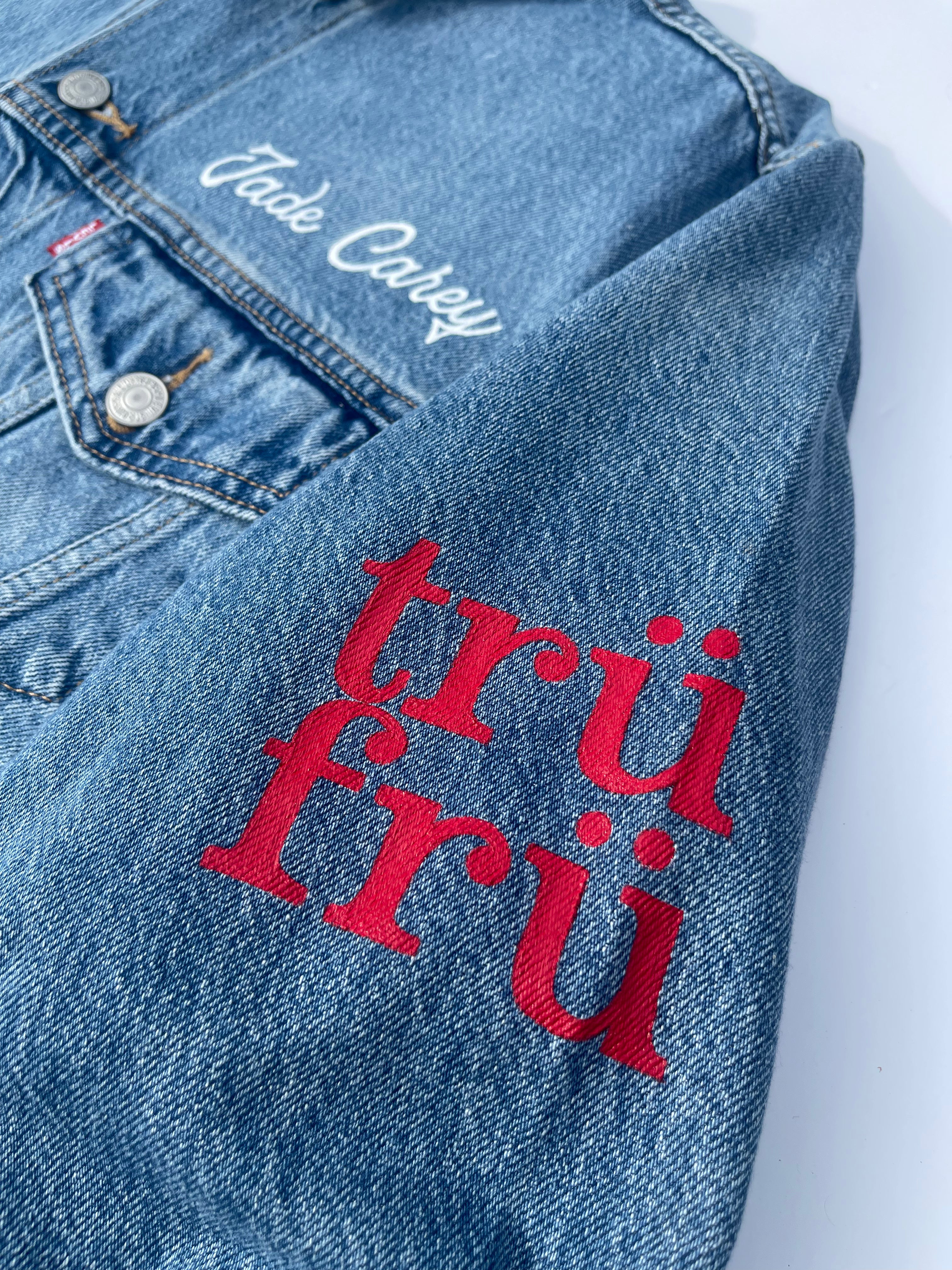 Trü Frü commissioned Katia to design and paint a denim jacket for the 2024 Olympian Medalist. (1/4)