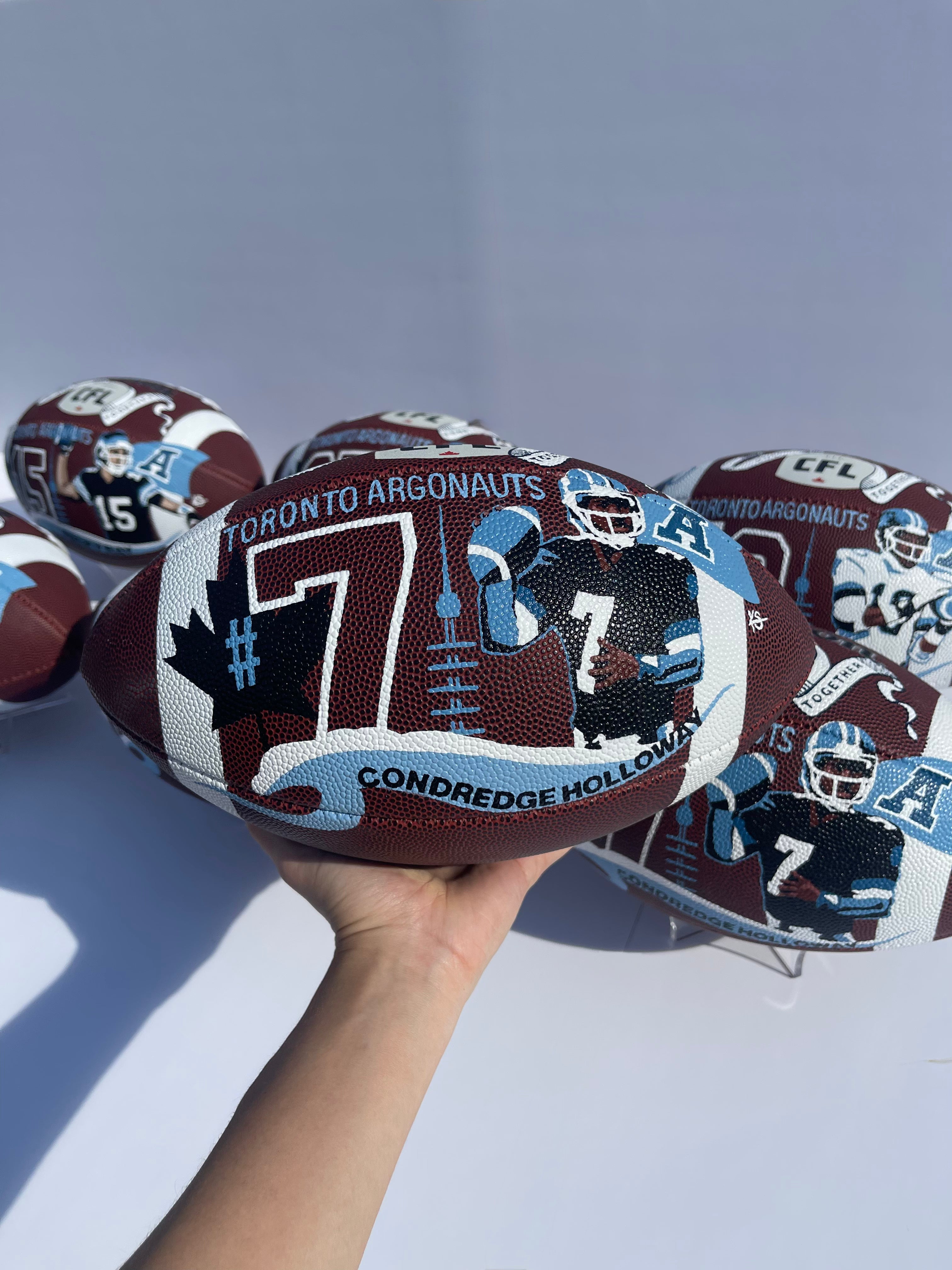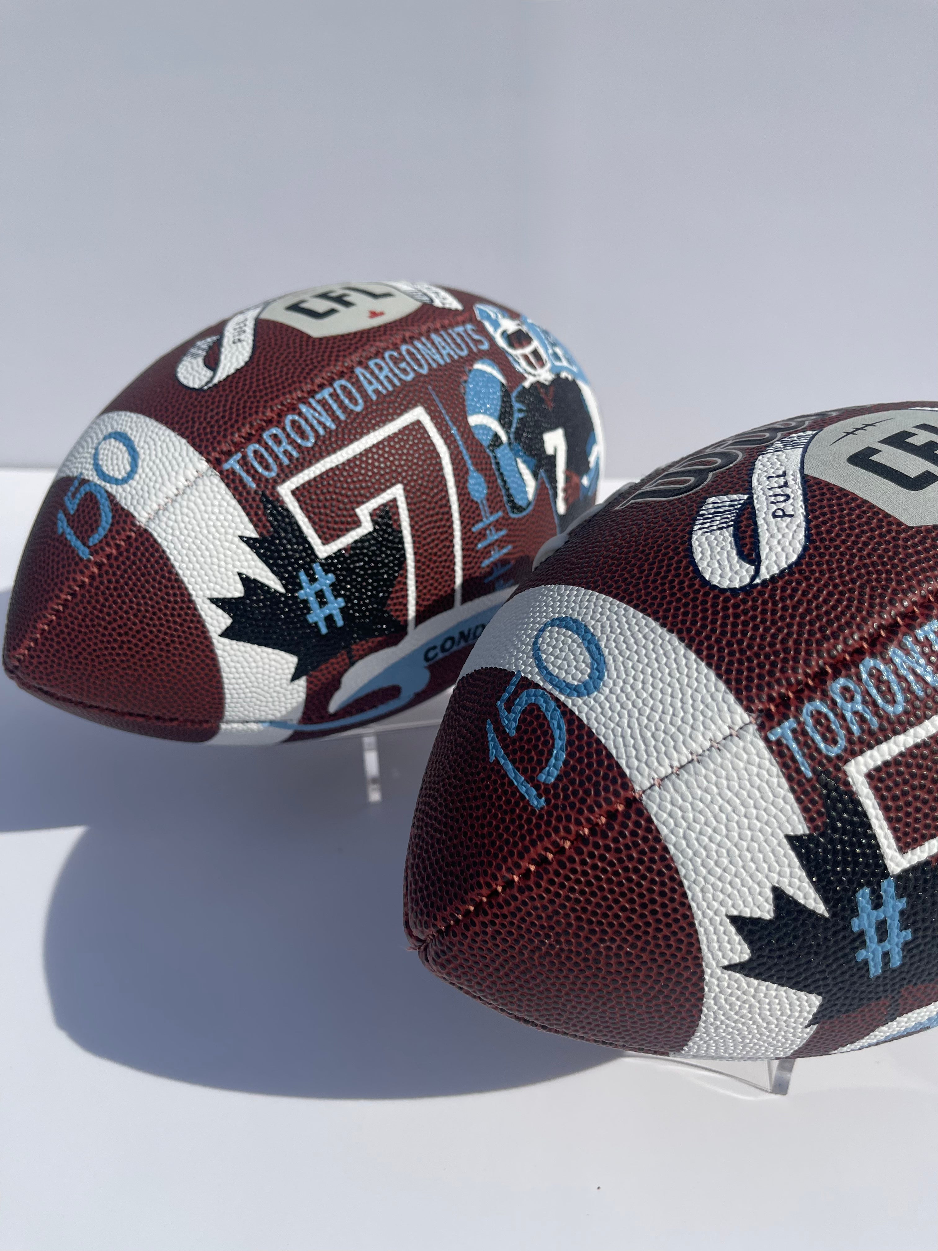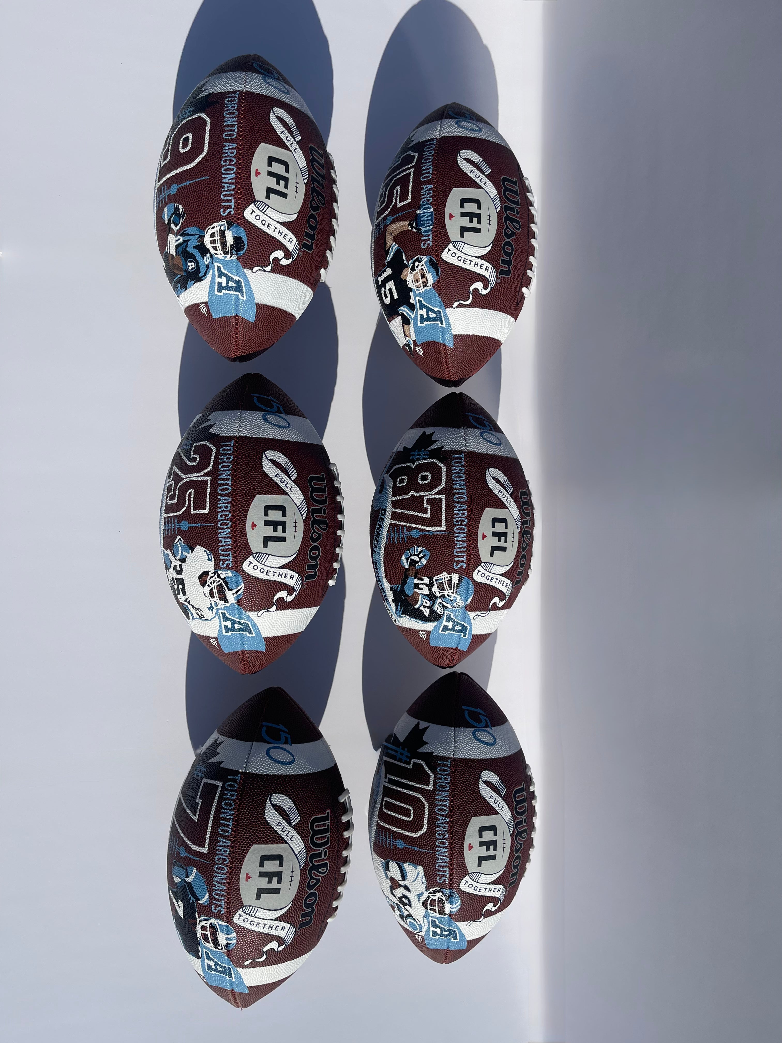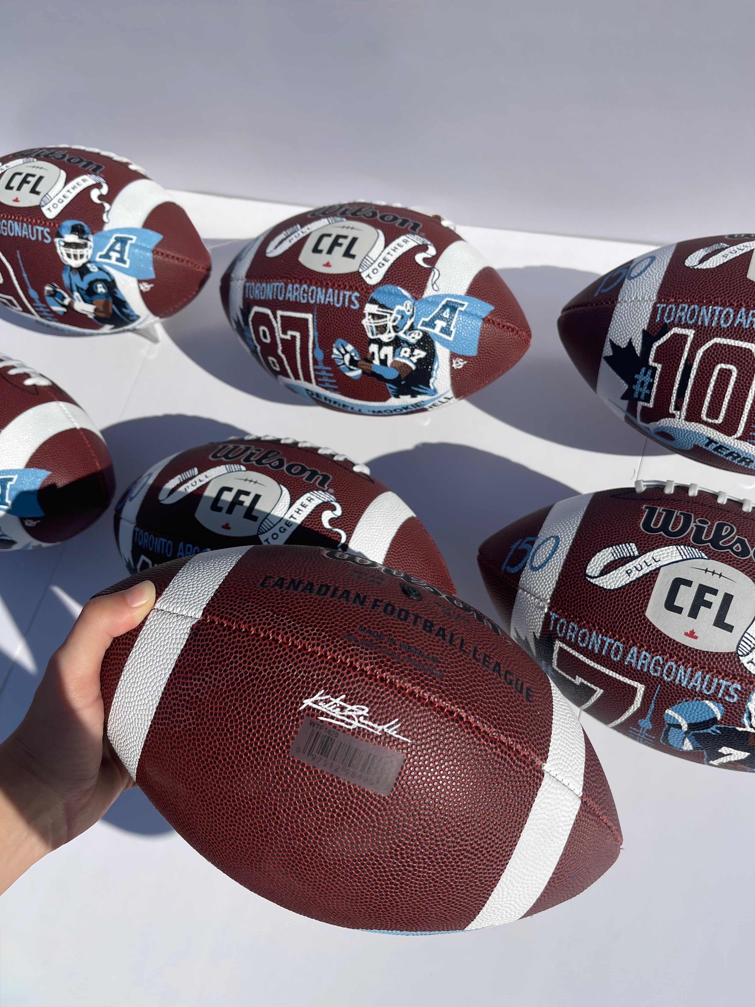 Seven hand-painted footballs for alumni Toronto Argonaut players: Damon Allen, Ricky Ray, Condredge Holloway, Raghib Ismail, Terry Greer, Derrell Mitchell