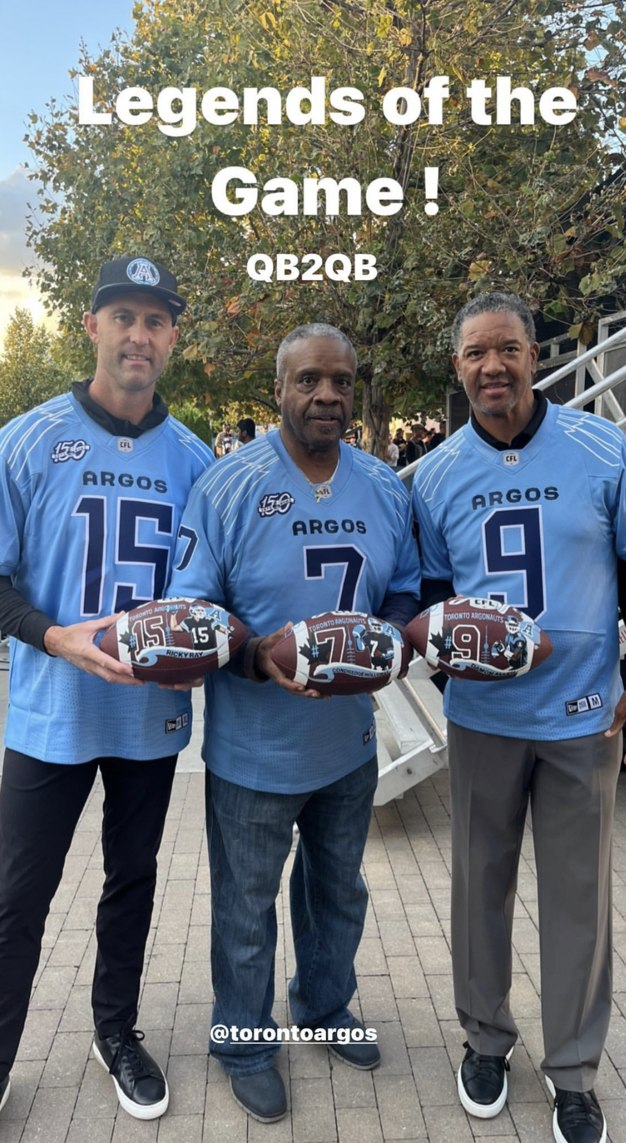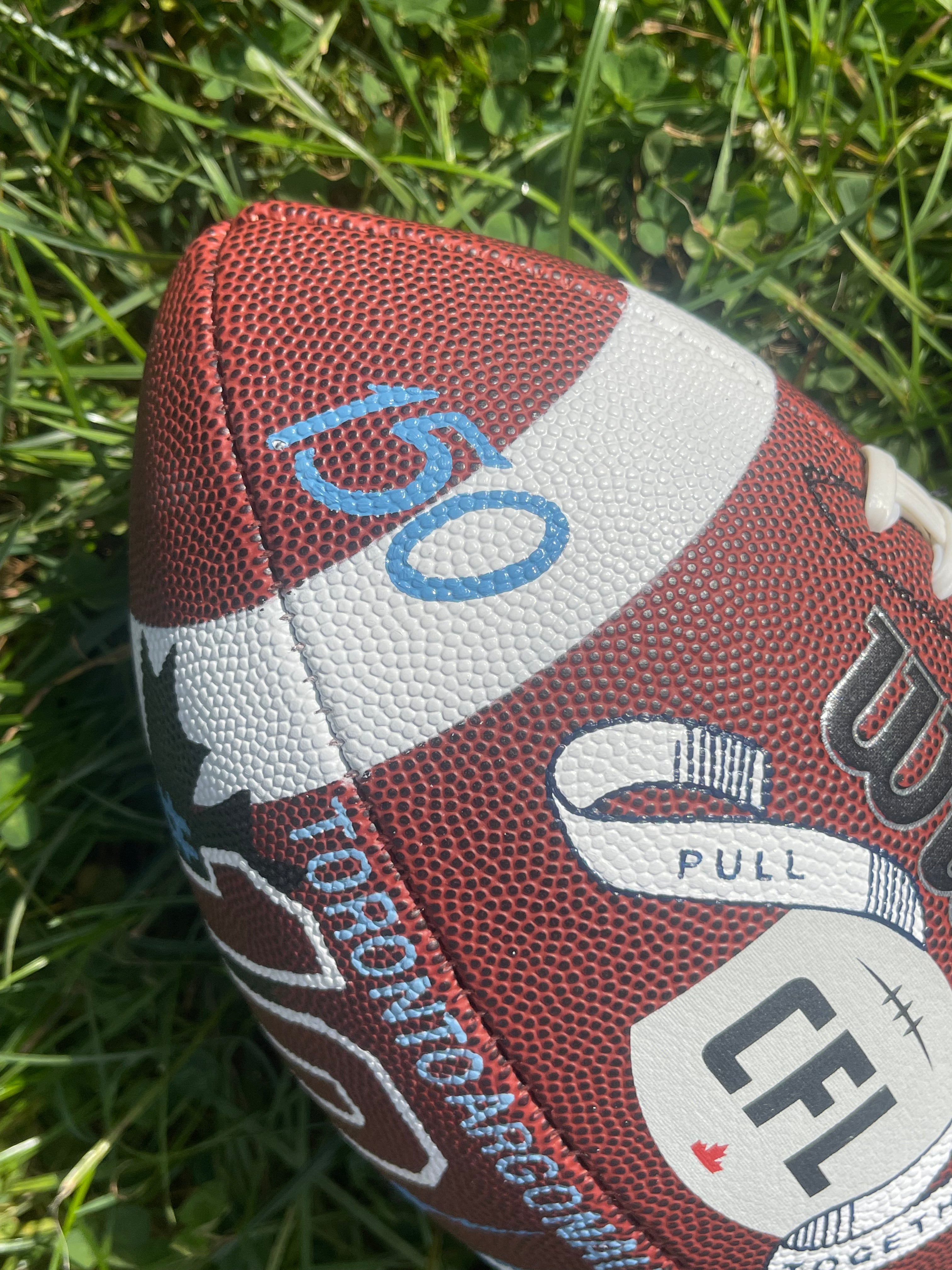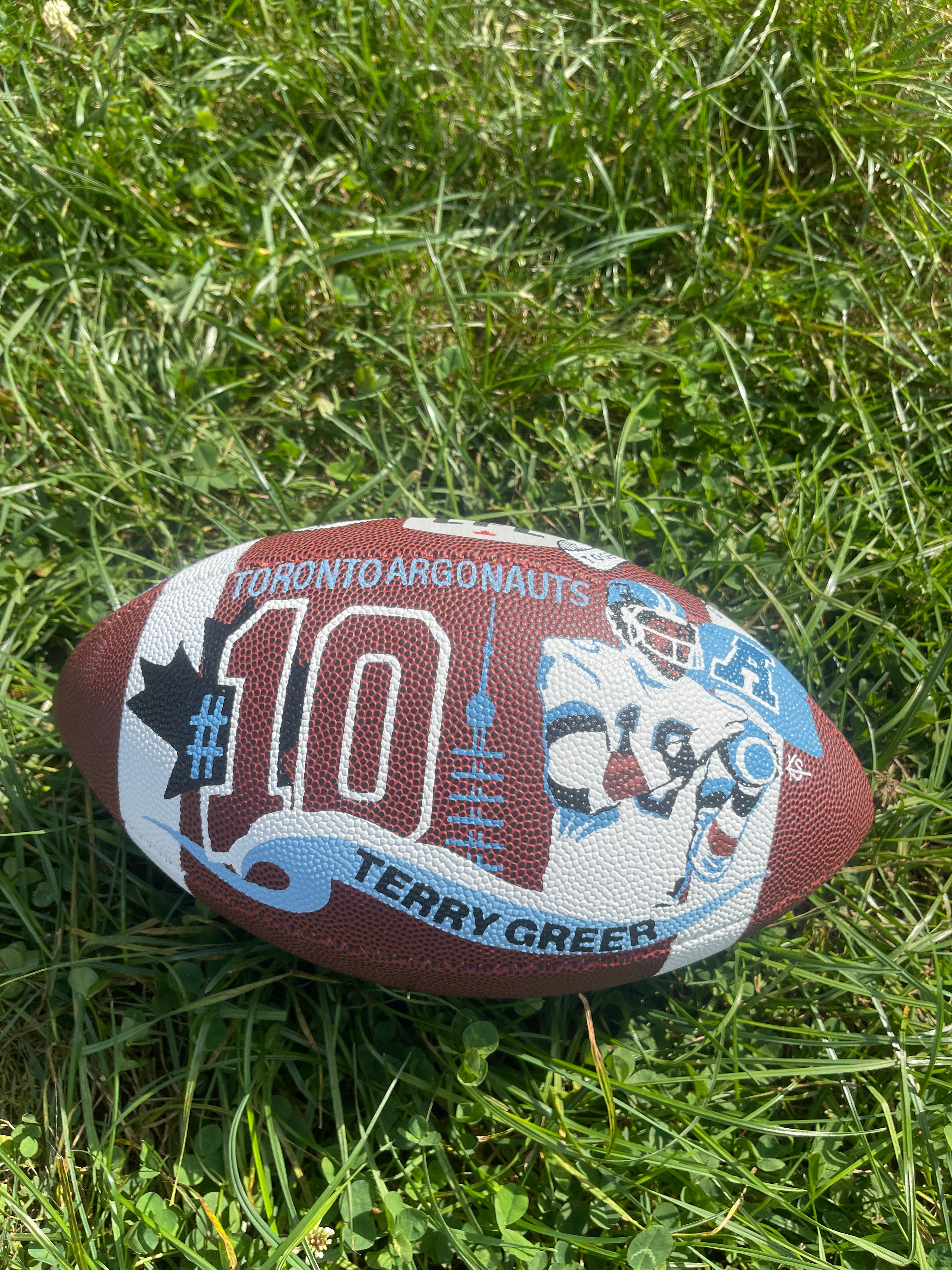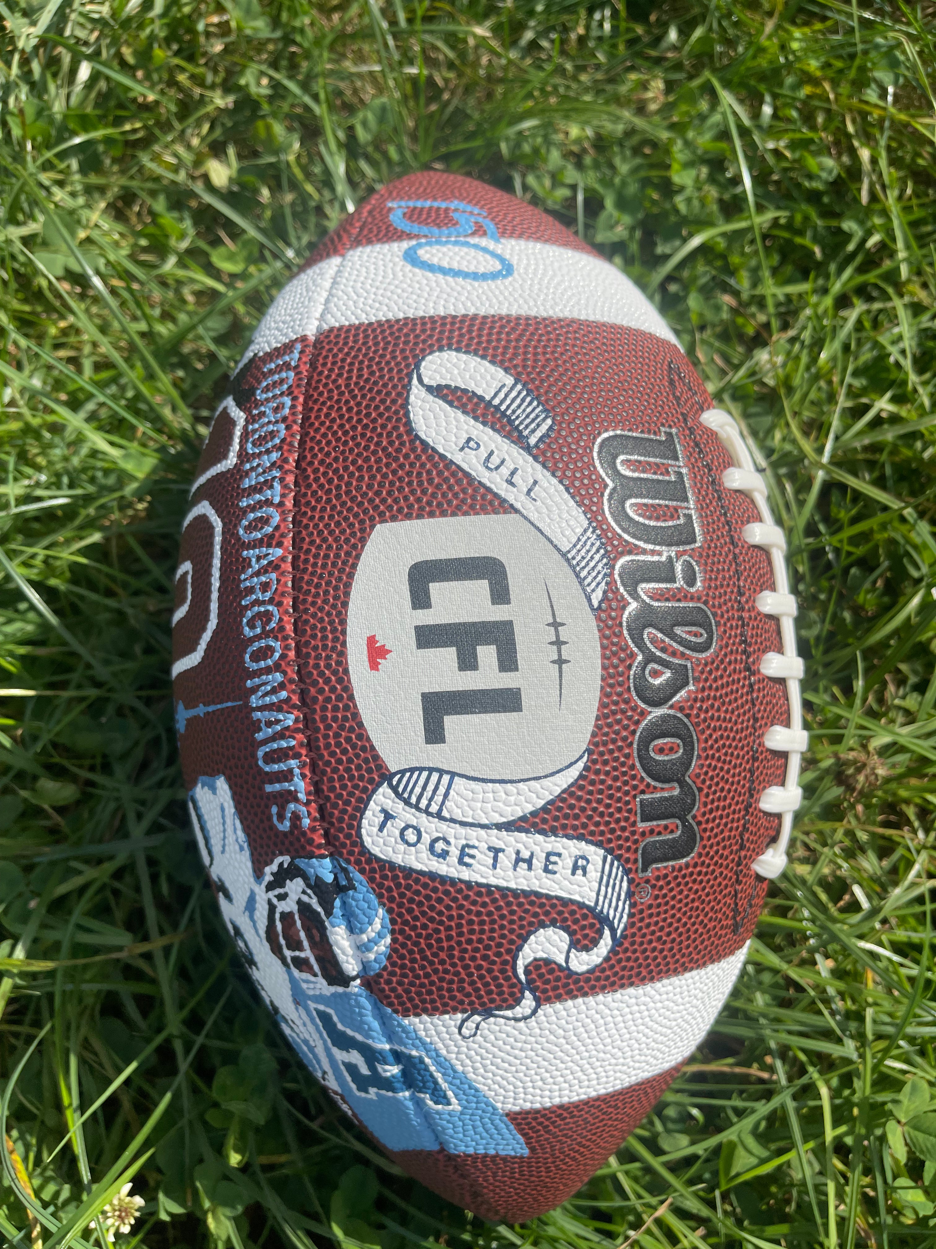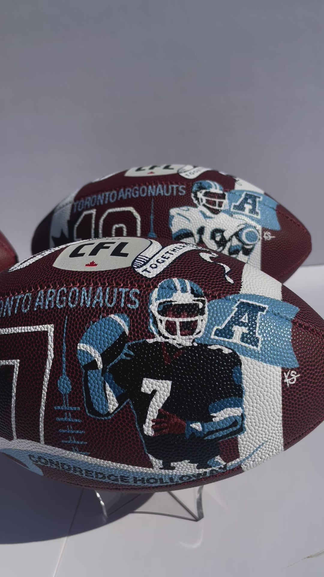 Seven hand-painted footballs for alumni Toronto Argonaut players: Damon Allen, Ricky Ray, Condredge Holloway, Raghib Ismail, Terry Greer, Derrell Mitchell
