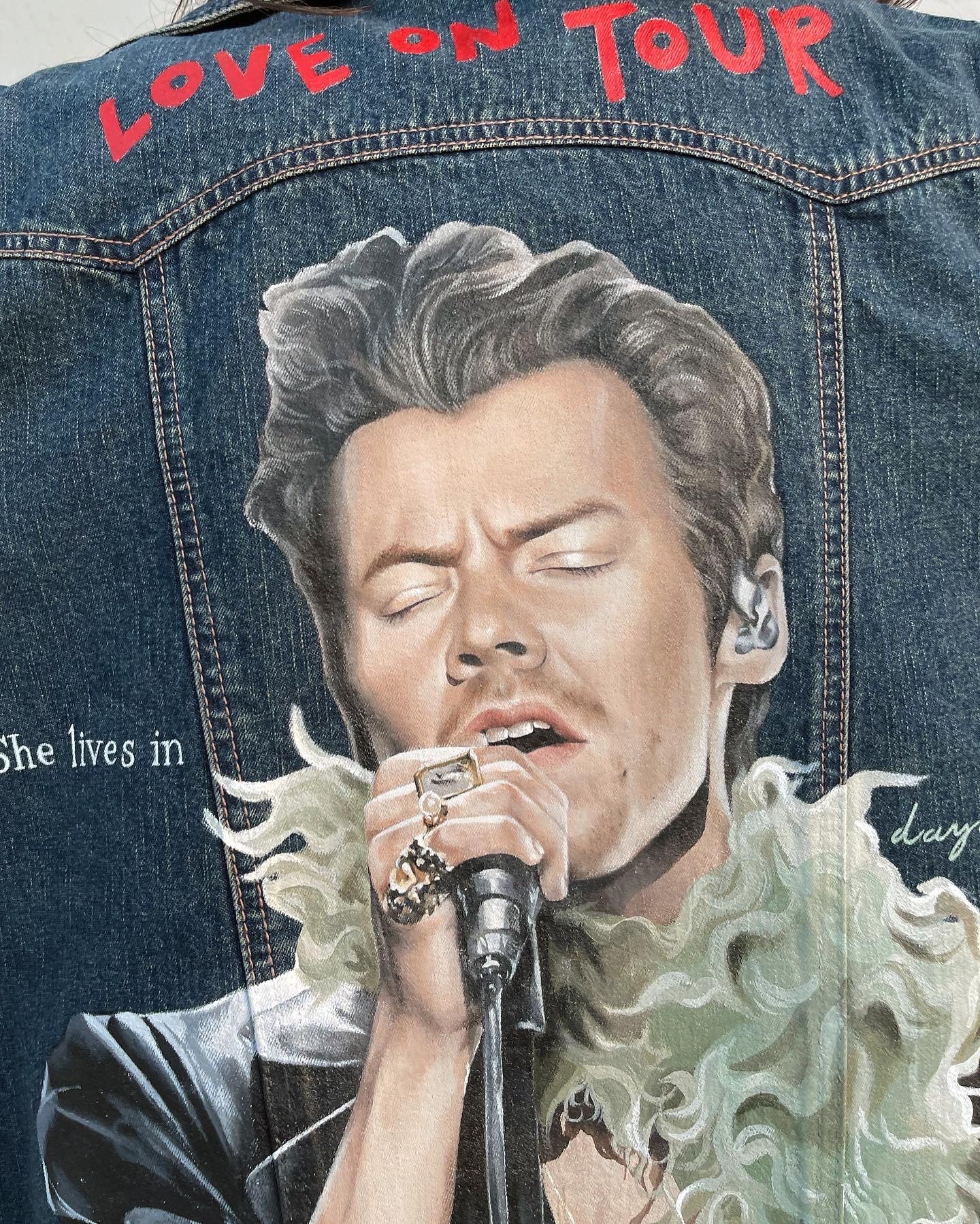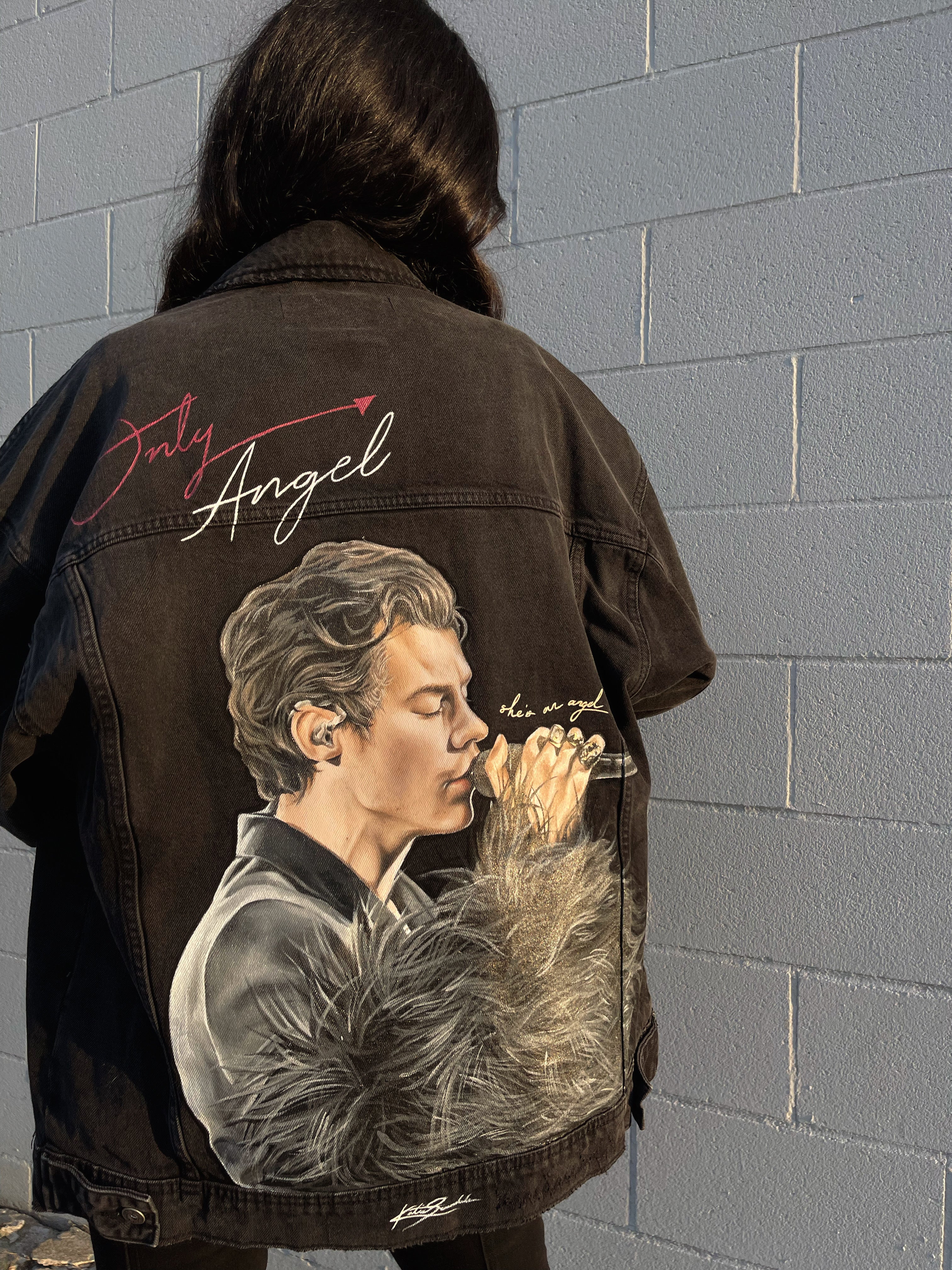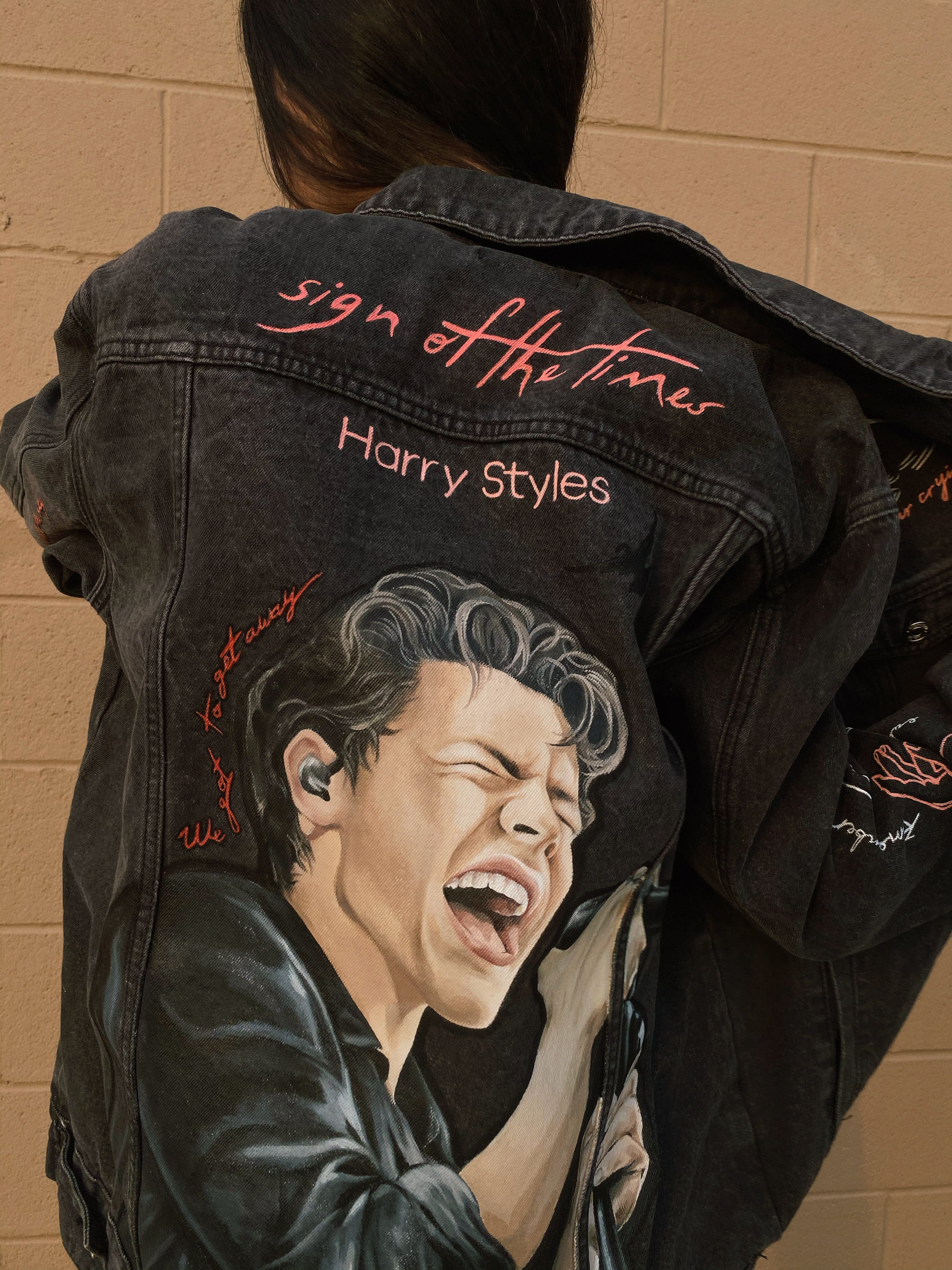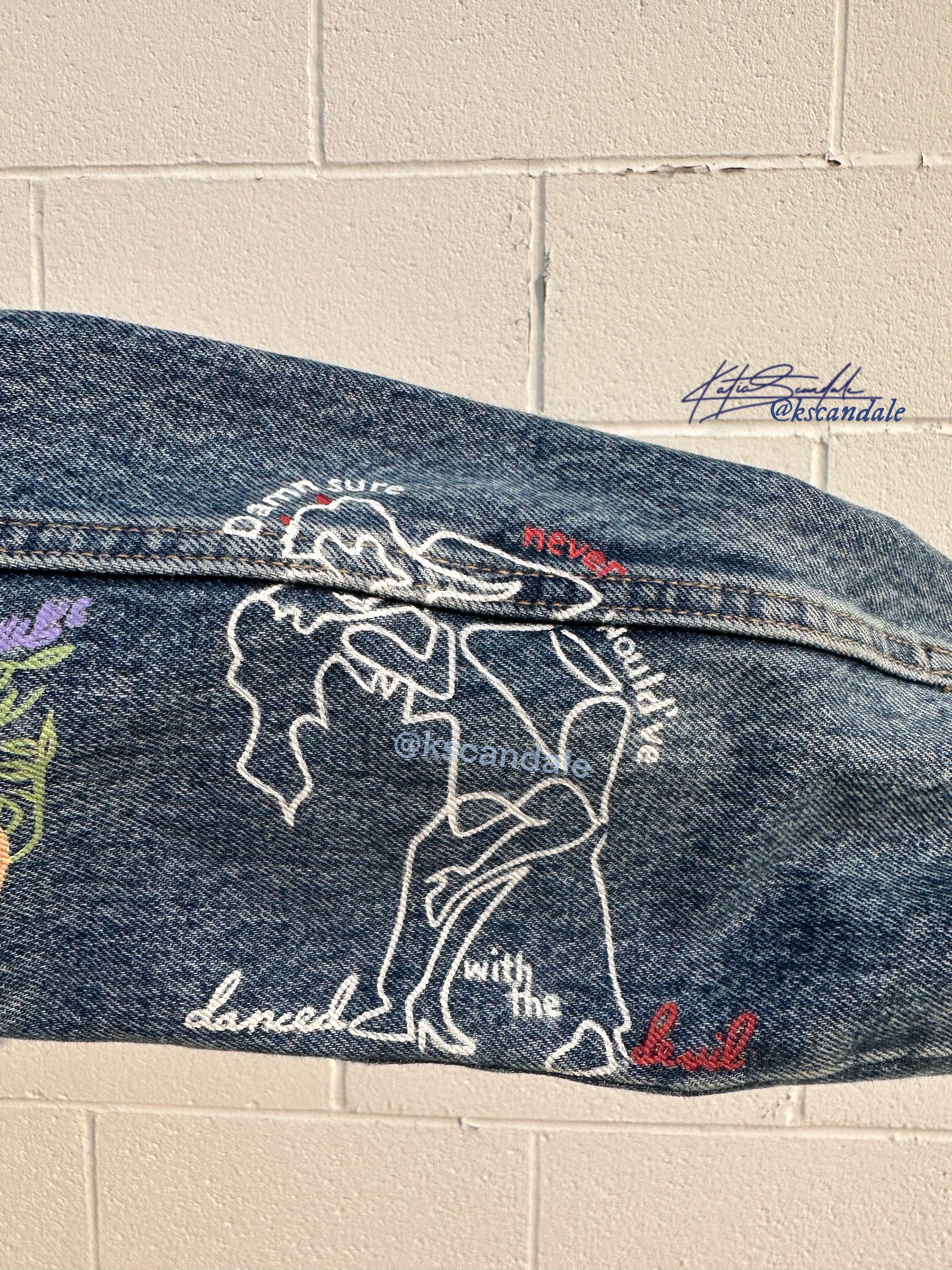 Custom Denim Jackets are a unique and high demand work from Katia. The jackets feature different celebrities and themes. They are usually made to order and specially designed for each client.