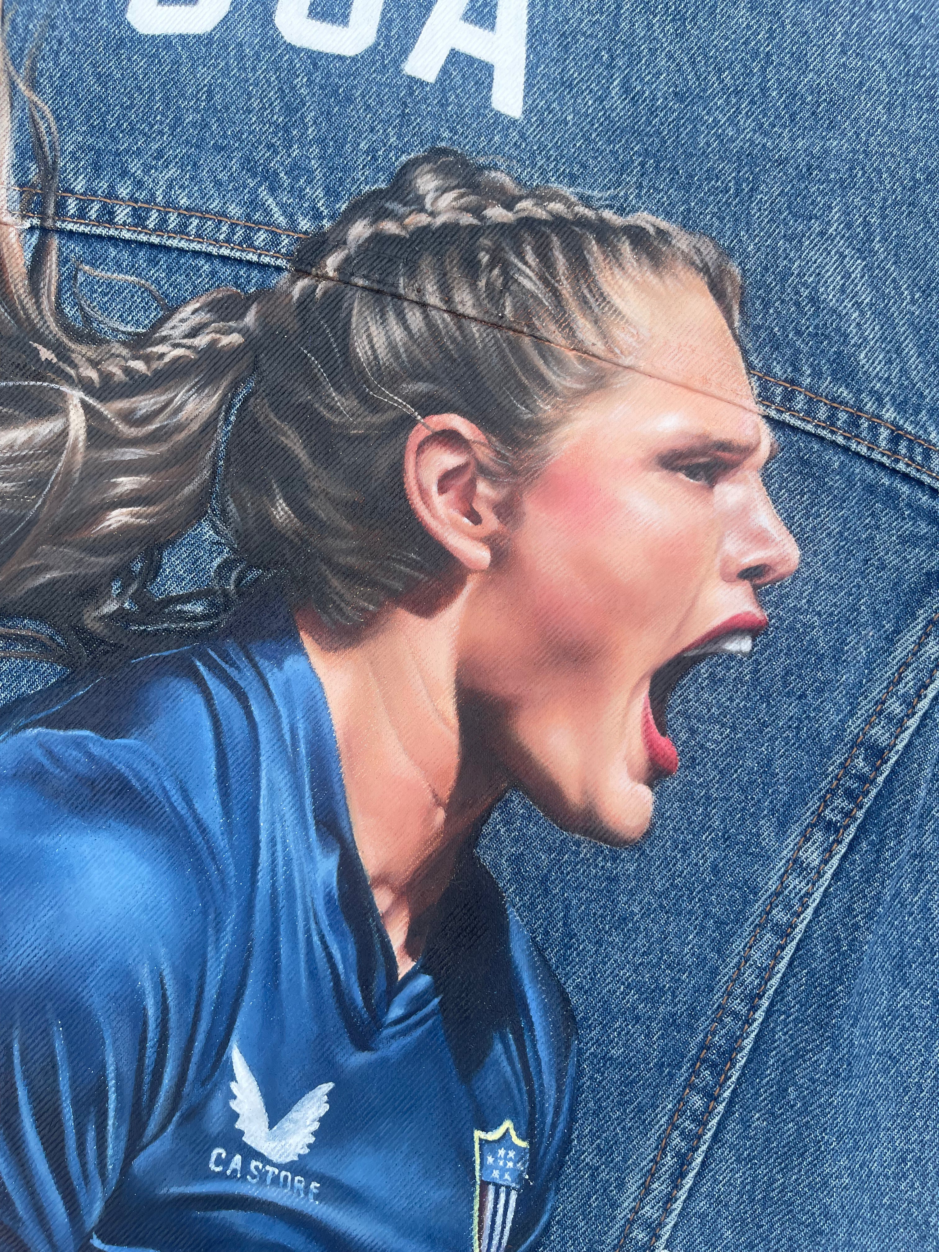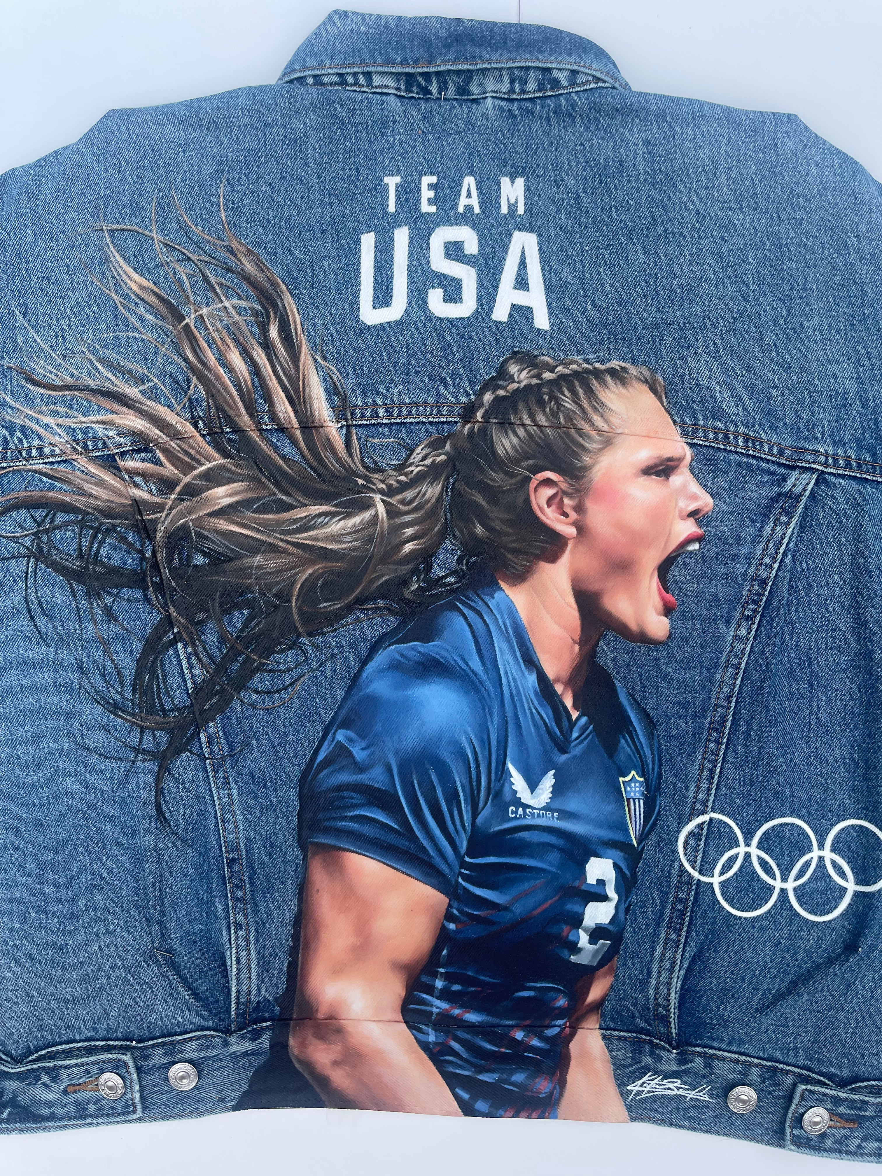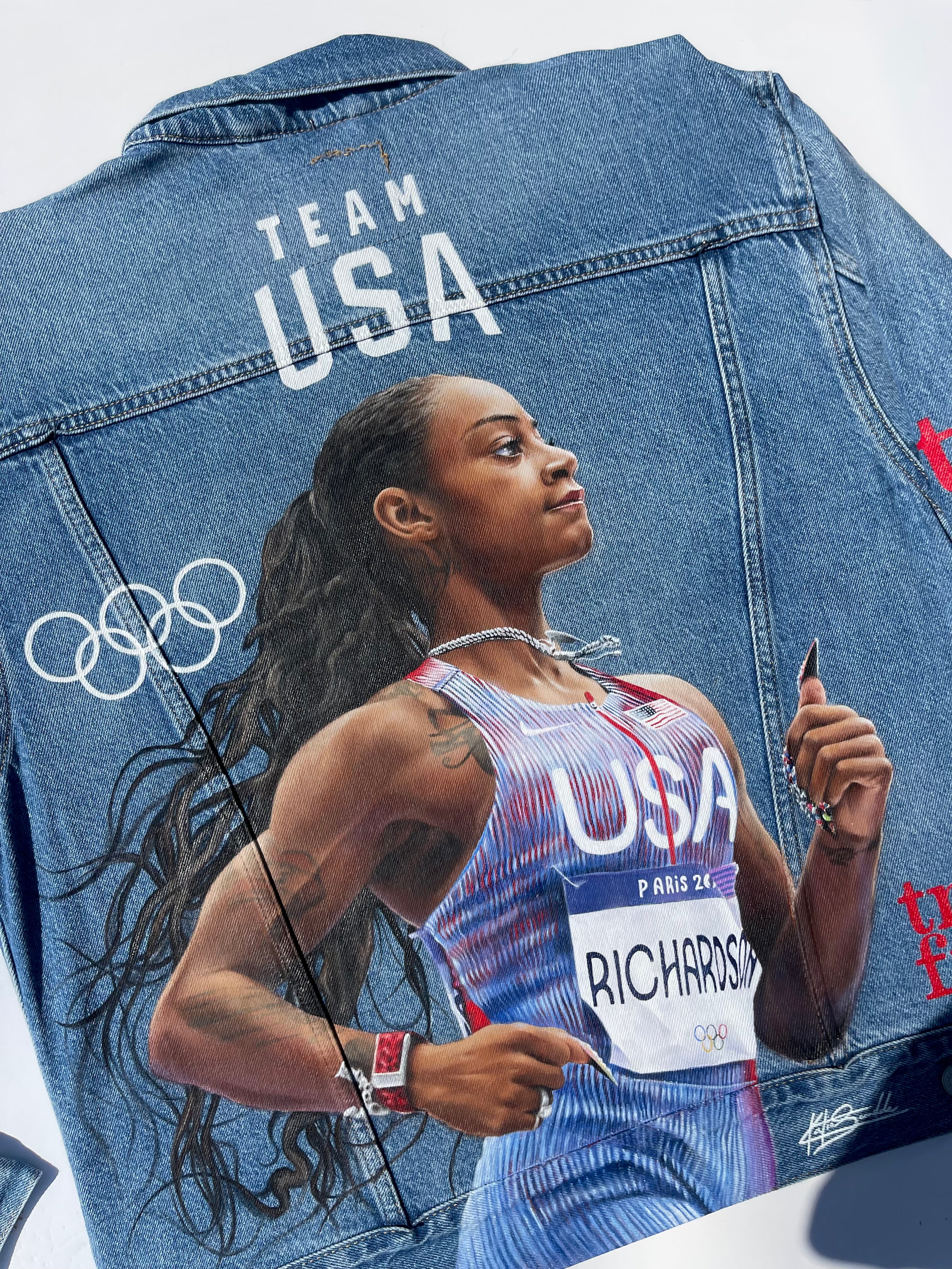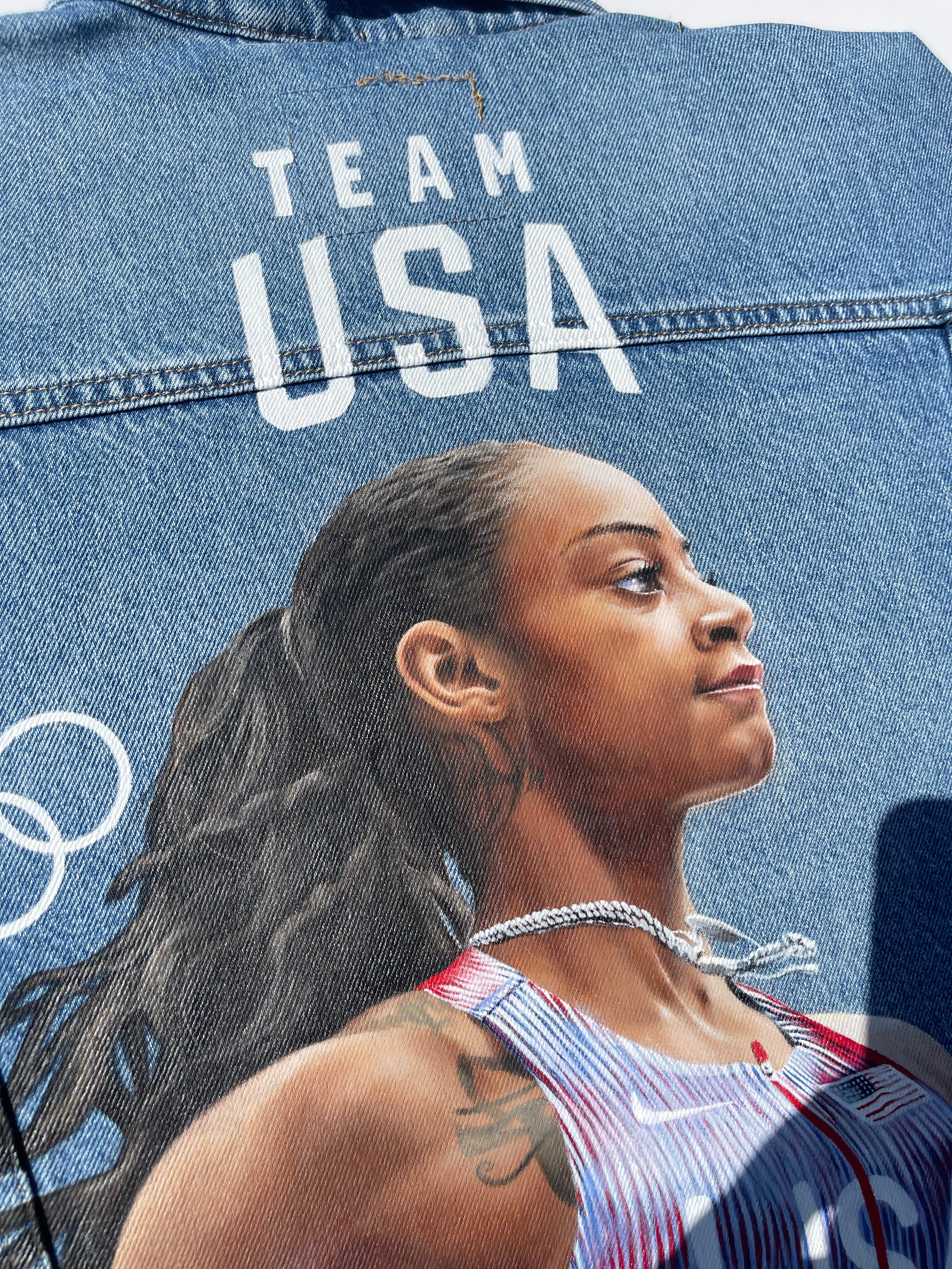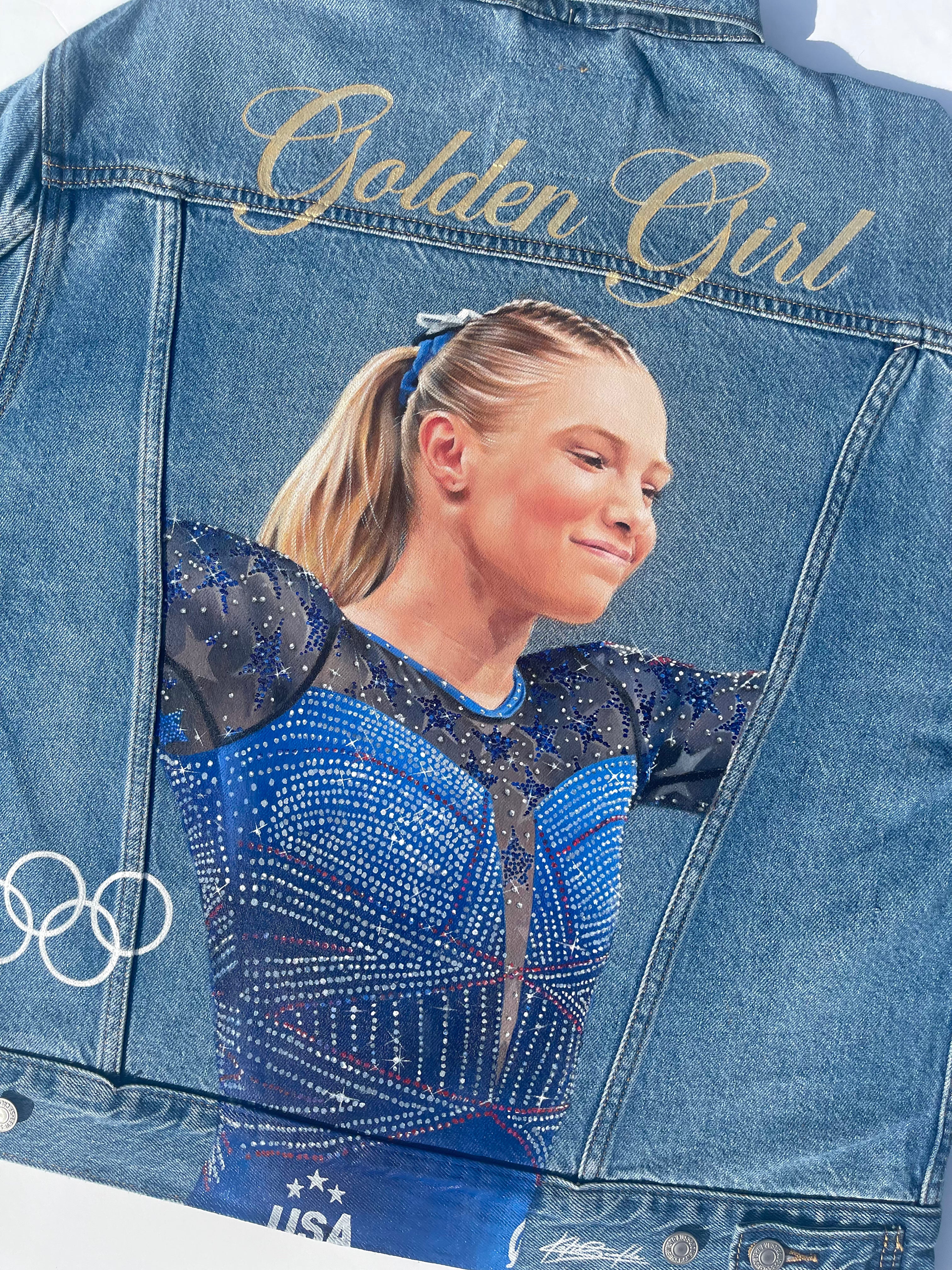 TRÜ FRÜ commissioned denim jackets for four Olympian medalists, Simone Biles, Ilona Maher, Sha'Carrie Richardson and Jade Carey